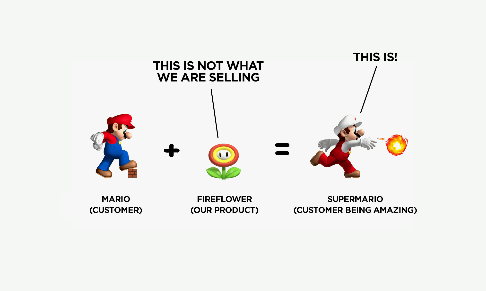 One way to think about it is to imagine the consumer as Mario, the Nintendo character, and your product as the fire flower. Nobody wants the fire flower for its own sake. They want the fire flower to turn Mario into Super Mario. That’s, well, that’s the point! And yet, most brands are still obstinately selling the fire flower.