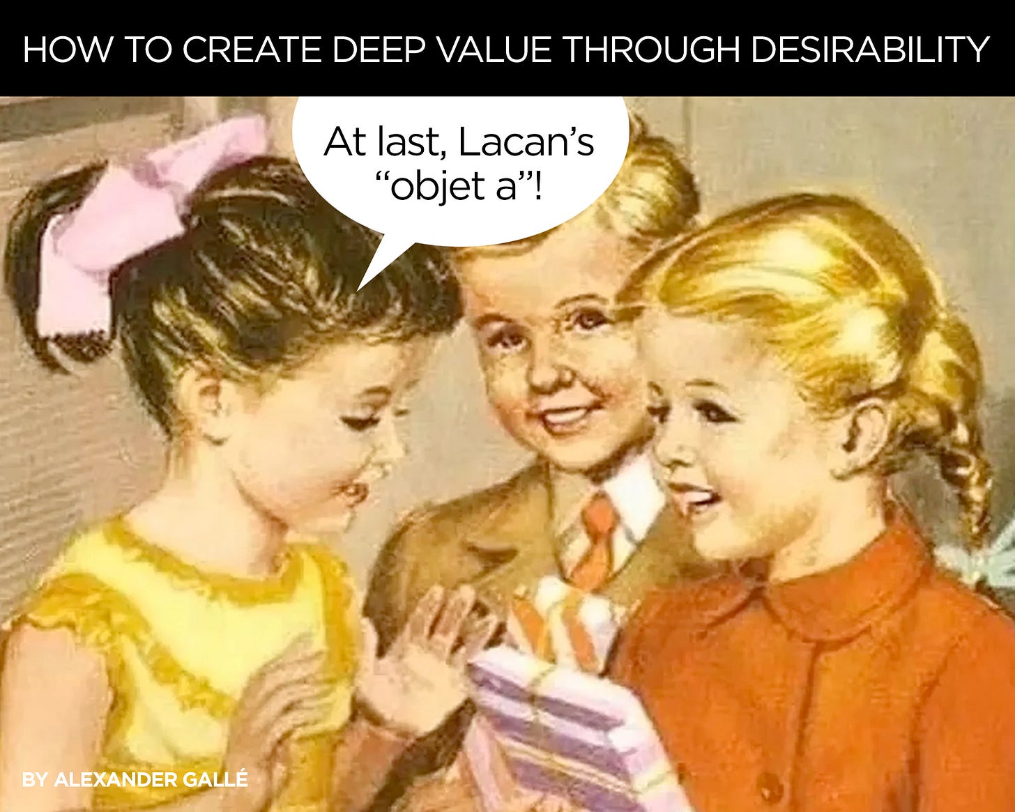 Here, we’ll borrow a concept from someone who spent a good 20 years of his life writing about the psychology of desire: Jacques Lacan. What he referred to as “objet a” is the ever-longed-for-and-never-found object (or rather, object-cause of desire) that we feel a sense of loss and nostalgia for, believing we once had it when we were in the state of “jouissance” (ecstasy or bliss) as babies in our mother’s arms, before submitting to language, articulated thoughts, and the messy business of being human.